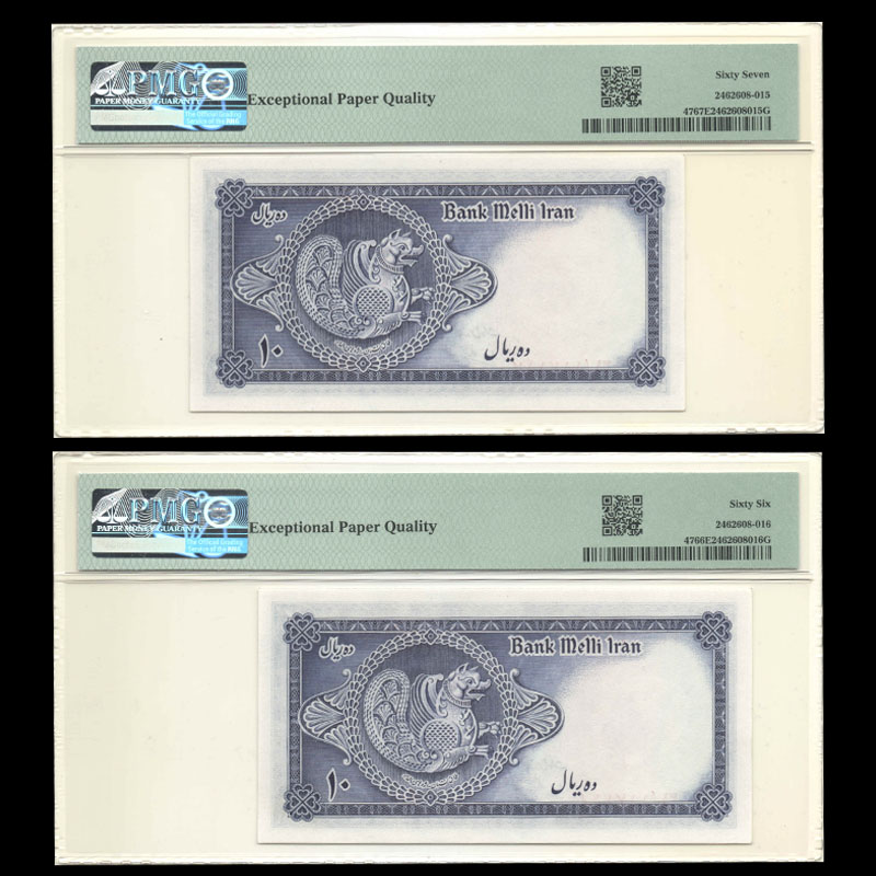 جفت اسکناس ده ریال محمدرضا شاه پهلوی – شماره تکرار 117117 – گرید 66 و 67