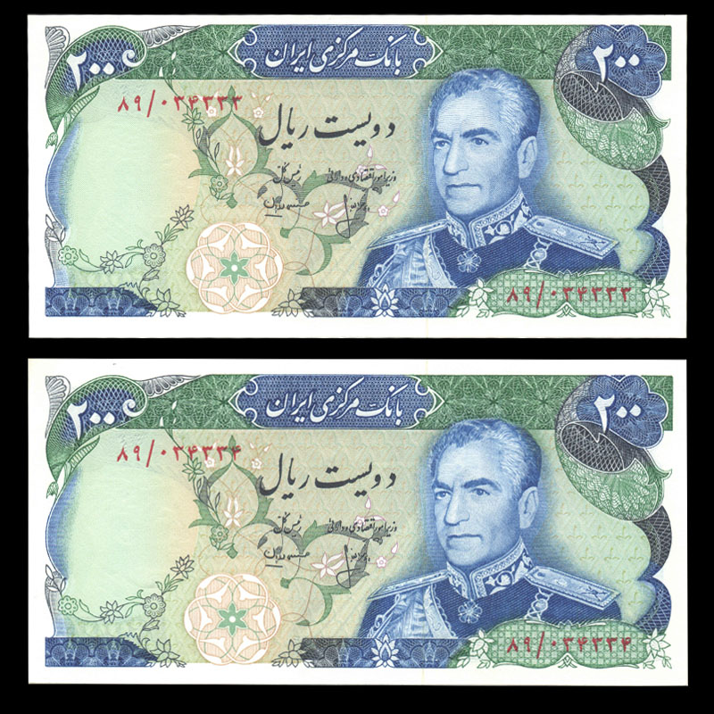 جفت اسکناس دویست ریال محمدرضا شاه پهلوی شماره قشنگ