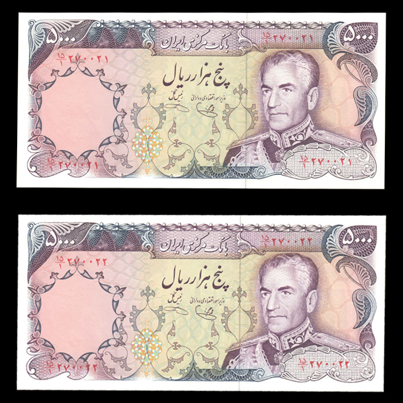 جفت اسکناس پنج هزار ریال محمدرضا شاه پهلوی شماره قشنگ