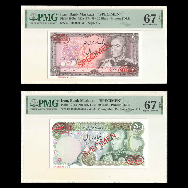 ست کامل اسکناسهای specimen یگانه مهران از 20 ریال تا 10000 ریال گرید شده با کسر 1/1