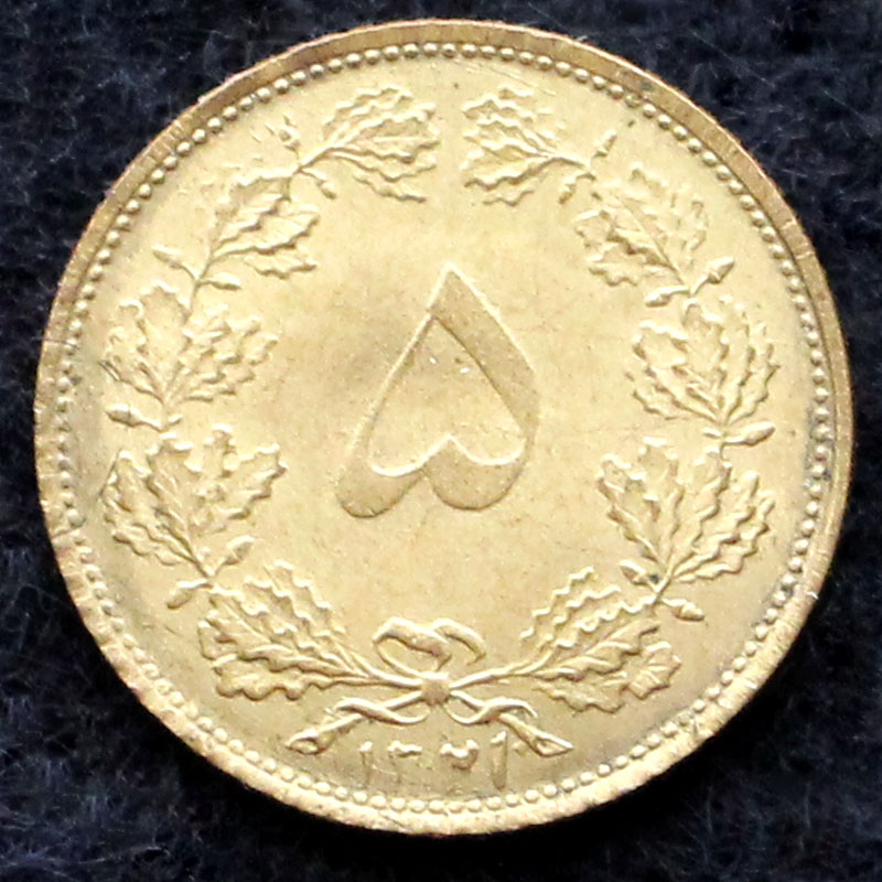 پنج دینار- شیر و خورشید – برگ زیتون و بلوط- تاج |