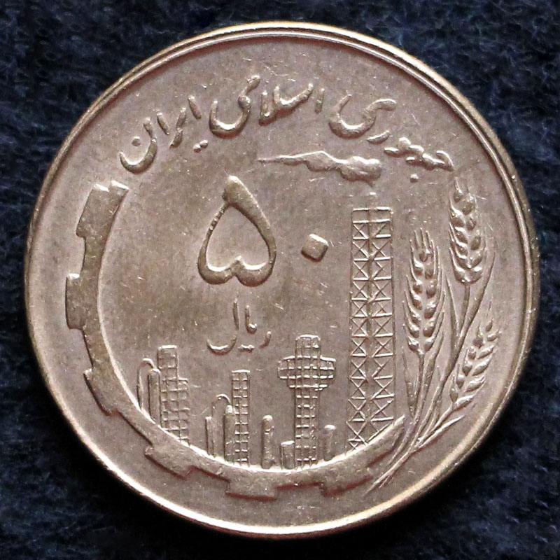 50 ریال – جمهوری اسلامی ایران – تاسیسات شرکت نفت – خوشه گندم و چرخ دنده نماد صنعت |