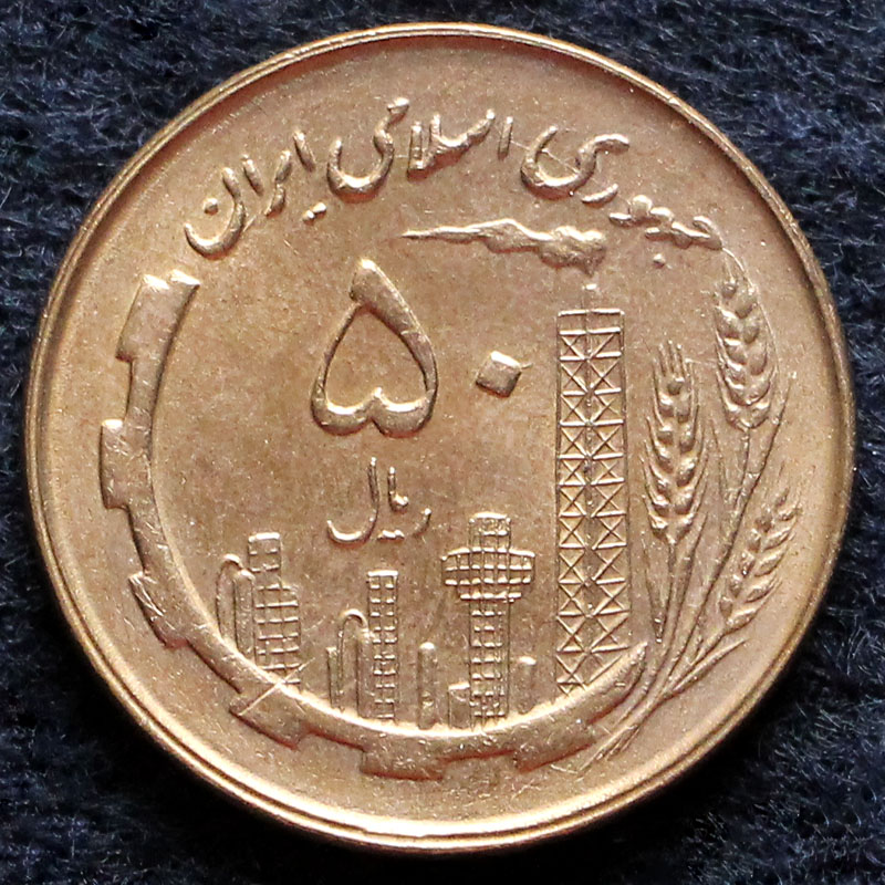 50 ریال – جمهوری اسلامی ایران – تاسیسات شرکت نفت – خوشه گندم و چرخ دنده نماد صنعت |