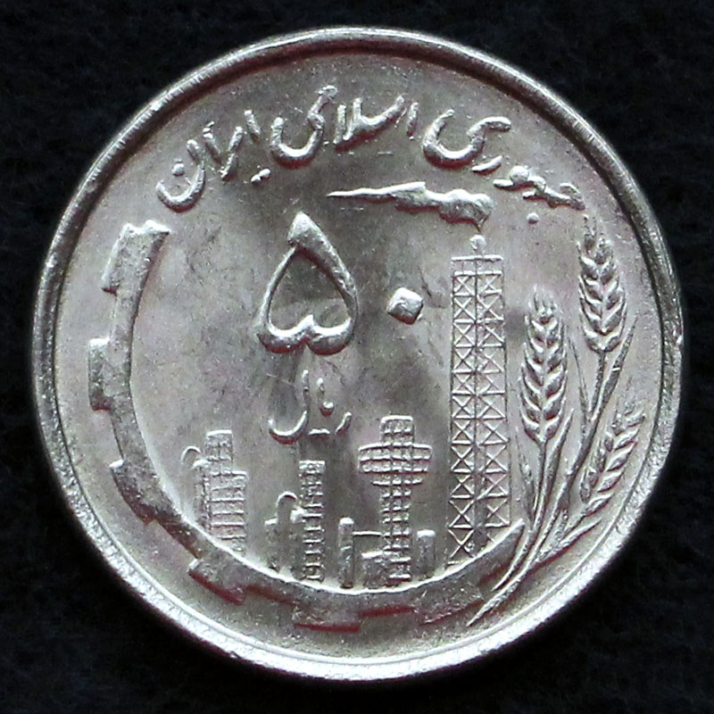 50 ریال – جمهوری اسلامی ایران – تاسیسات شرکت نفت – خوشه گندم و چرخ دنده نماد صنعت |