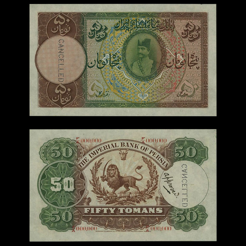 عدد و نوشته پنجاه تومان (انگلیسی) و شیر و خورشید |